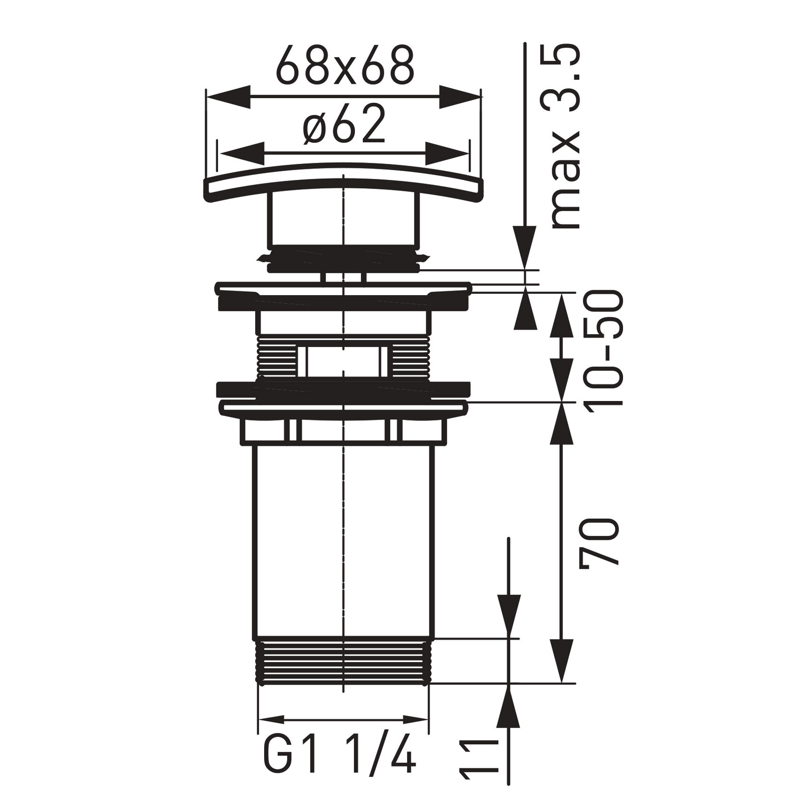 Trwały, mosiężny korek w kolorze szczotkowanego niklu do umywalek z przelewem. Zaślepka korka w kwadratowym kształcie.