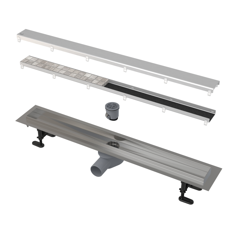 - Odpływ liniowy ze stali nierdzewnej (uszlachetniony materiał trawieniem i pasywacją, elektrochemicznie polerowany)
