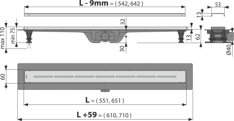 - Regulowane plastikowe nogi 0–35 mm umożliwiając szybką i wygodną instalację, w tym precyzyjne ustawienie spadu