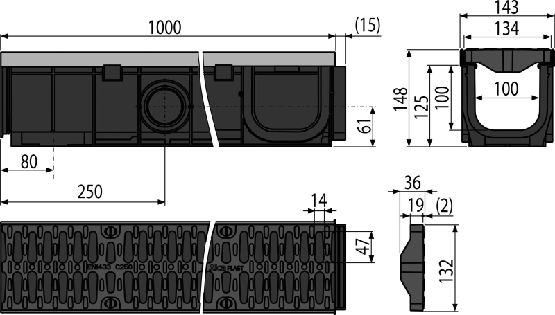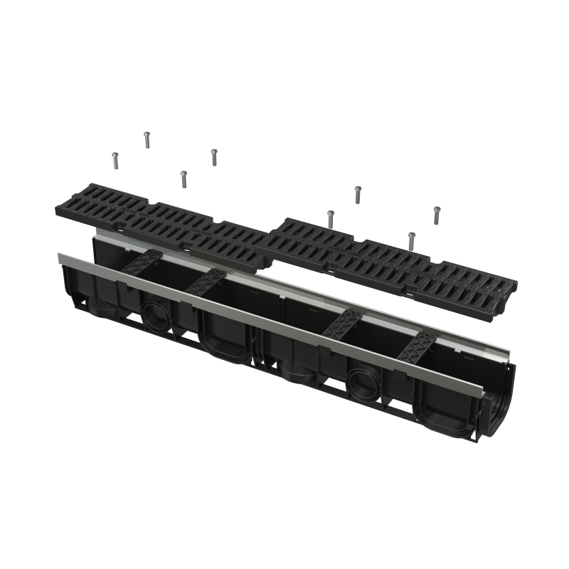 - Żeliwny ruszt – mocowany w odwodnieniu za pomocą 8 śrub ze stali nierdzewnej, szerokość szczeliny wlotowej 14 mm