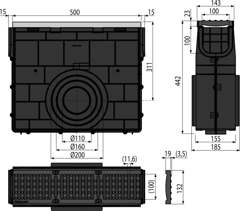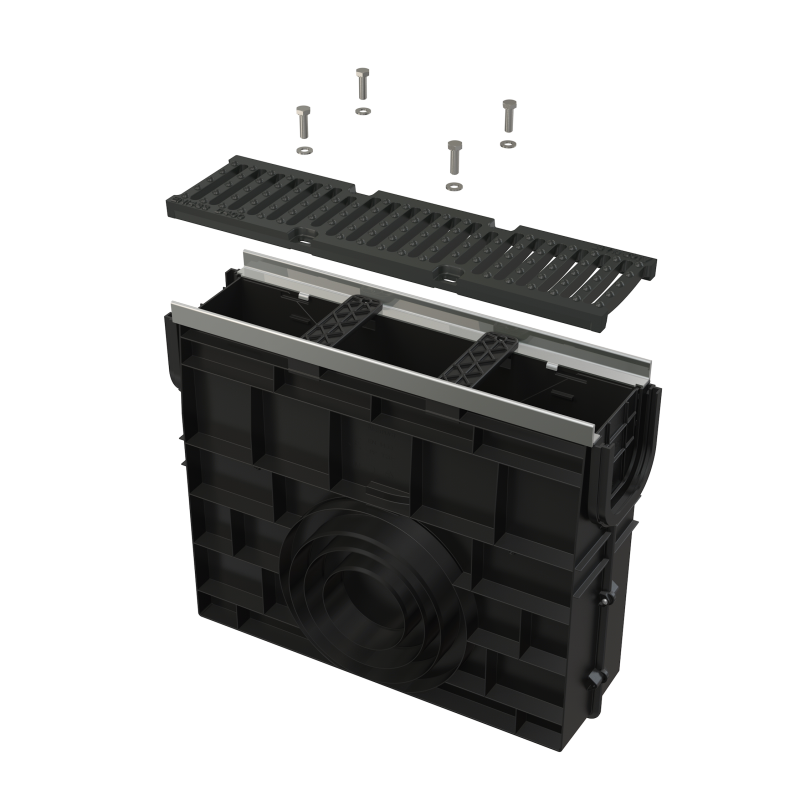 - Żeliwny ruszt – mocowany w odwodnieniu za pomocą 8 śrub ze stali nierdzewnej, szerokość szczeliny wlotowej 11,6 mm