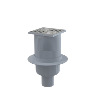 Kratka ściekowa 105×105/50/75 mm odpływ pionowy, kratka nierdzewna, kołnierz nierdzewny, dwa poziomy izolacji, kombinowany syfon