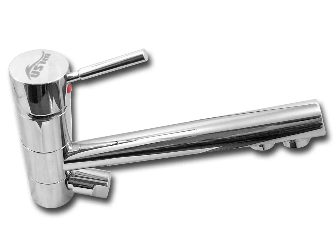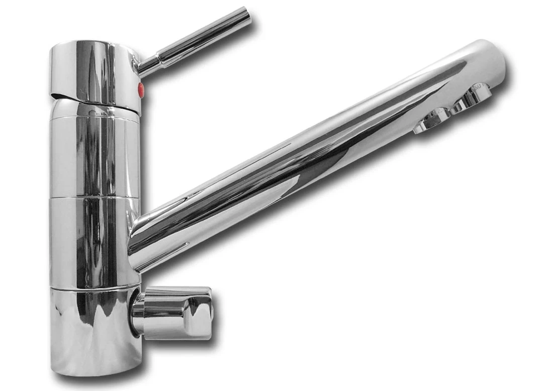 Trójdrożna bateria zlewozmywakowa z podłączeniem na wodę zimną, gorącą oraz filtrowaną. Możliwa do zastosowania w systemach odwróconej osmozy typu RO4 i RO5 oraz w systemach przepływowych FS2 i FS3.