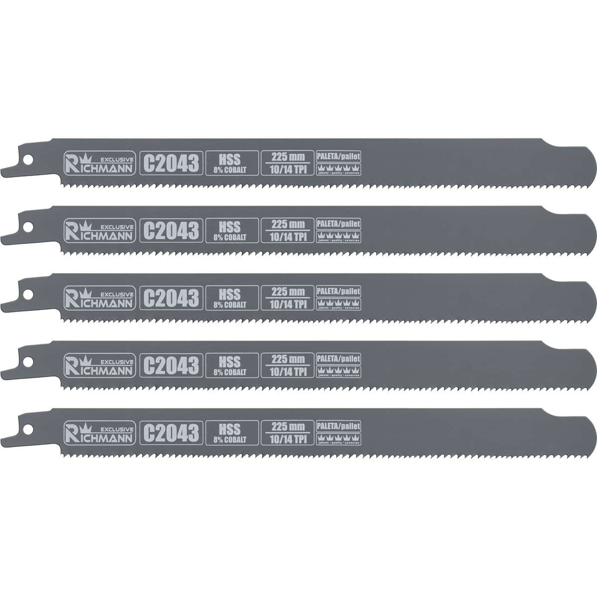 Zestaw 5 szt. brzeszczotów HSS bimetal o długości 225 mm przeznaczonych do pił szablastych.