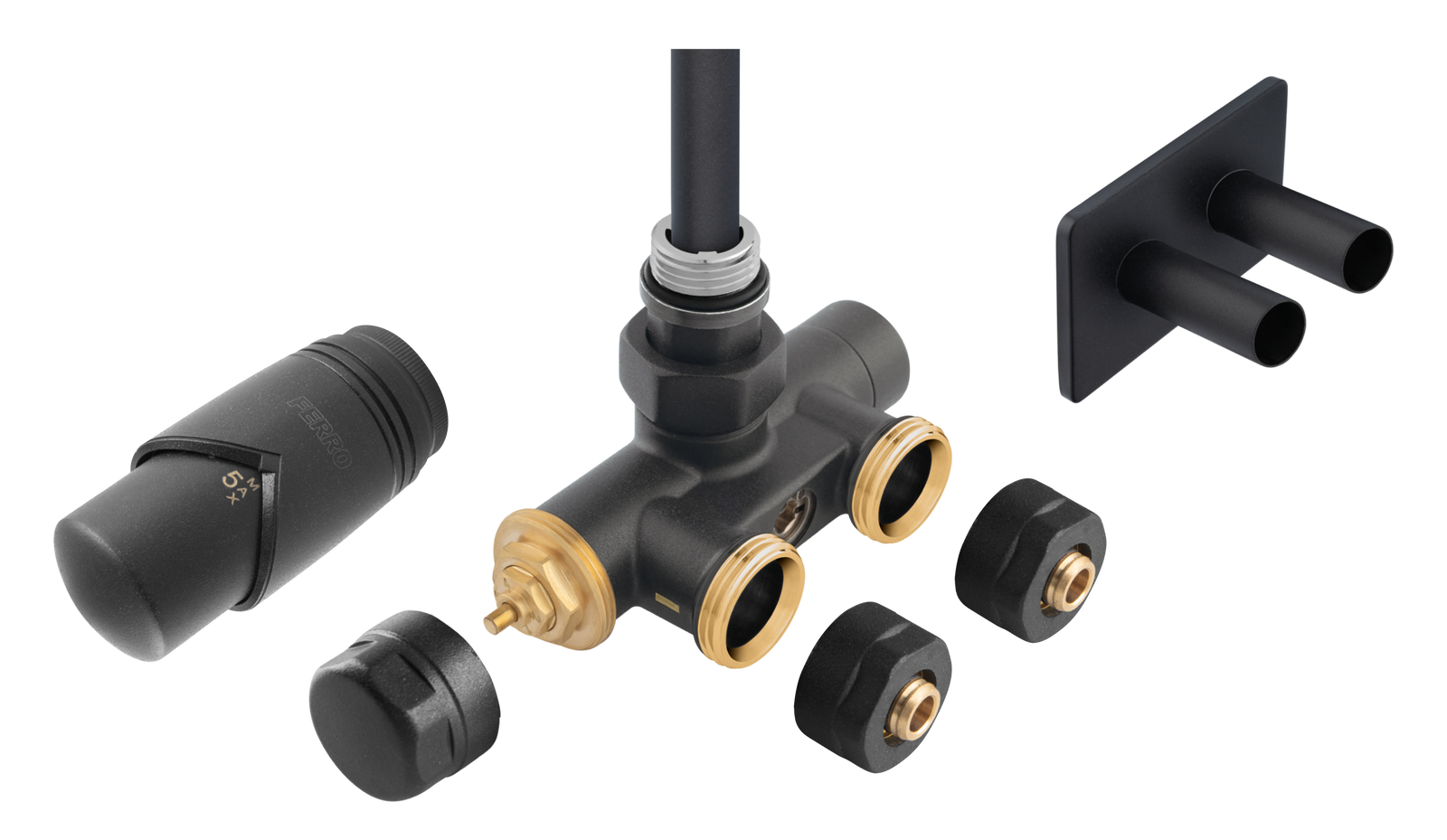 Dekoracyjny zestaw termostatyczny z nastawą wstępną, tuleją zanurzeniową i głowicą termostatyczną, antracytowy