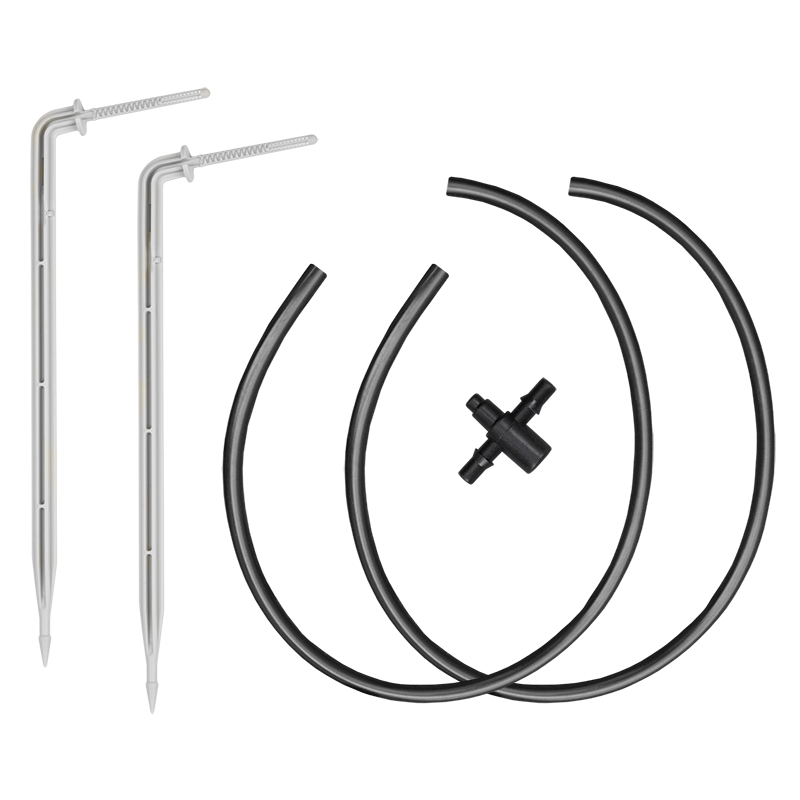 Długi kątowy kroplownik patykowy 2,2l/h z dwójnikiem, 2x wężyk 50cm