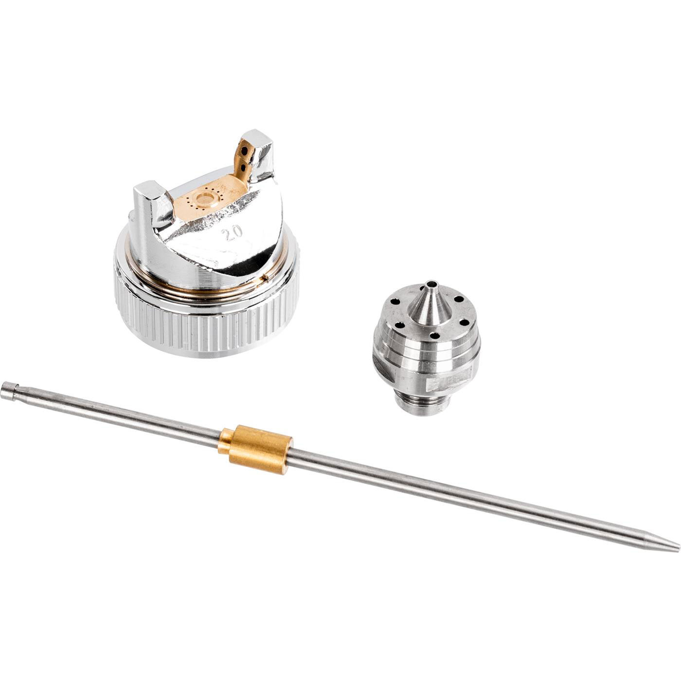W zestawie znajduje się dysza zewnętrzna powietrza wykonana z aluminium oraz miedzi, stalowa dysza wewnętrzna farby oraz iglica.