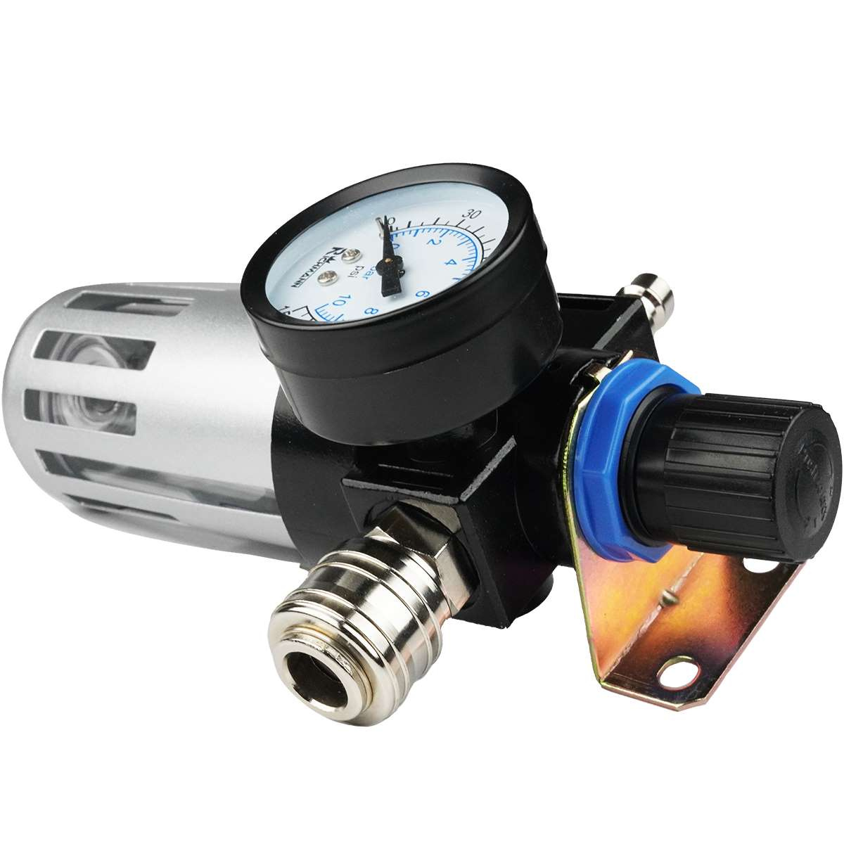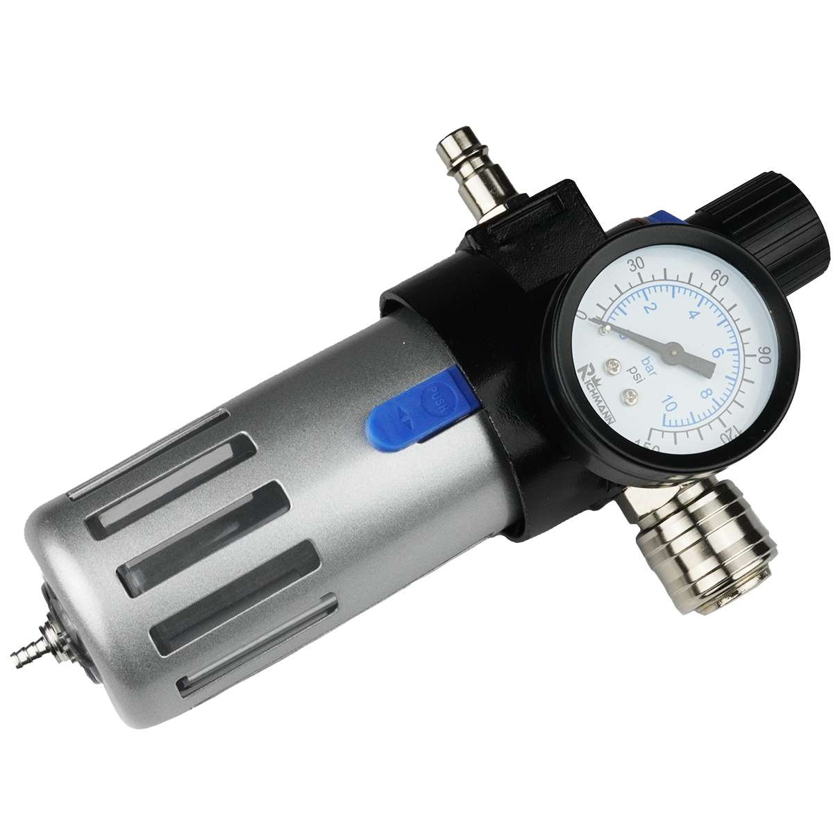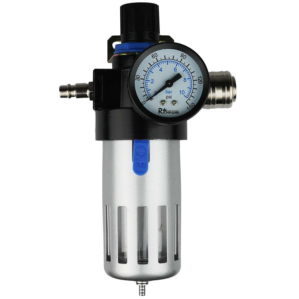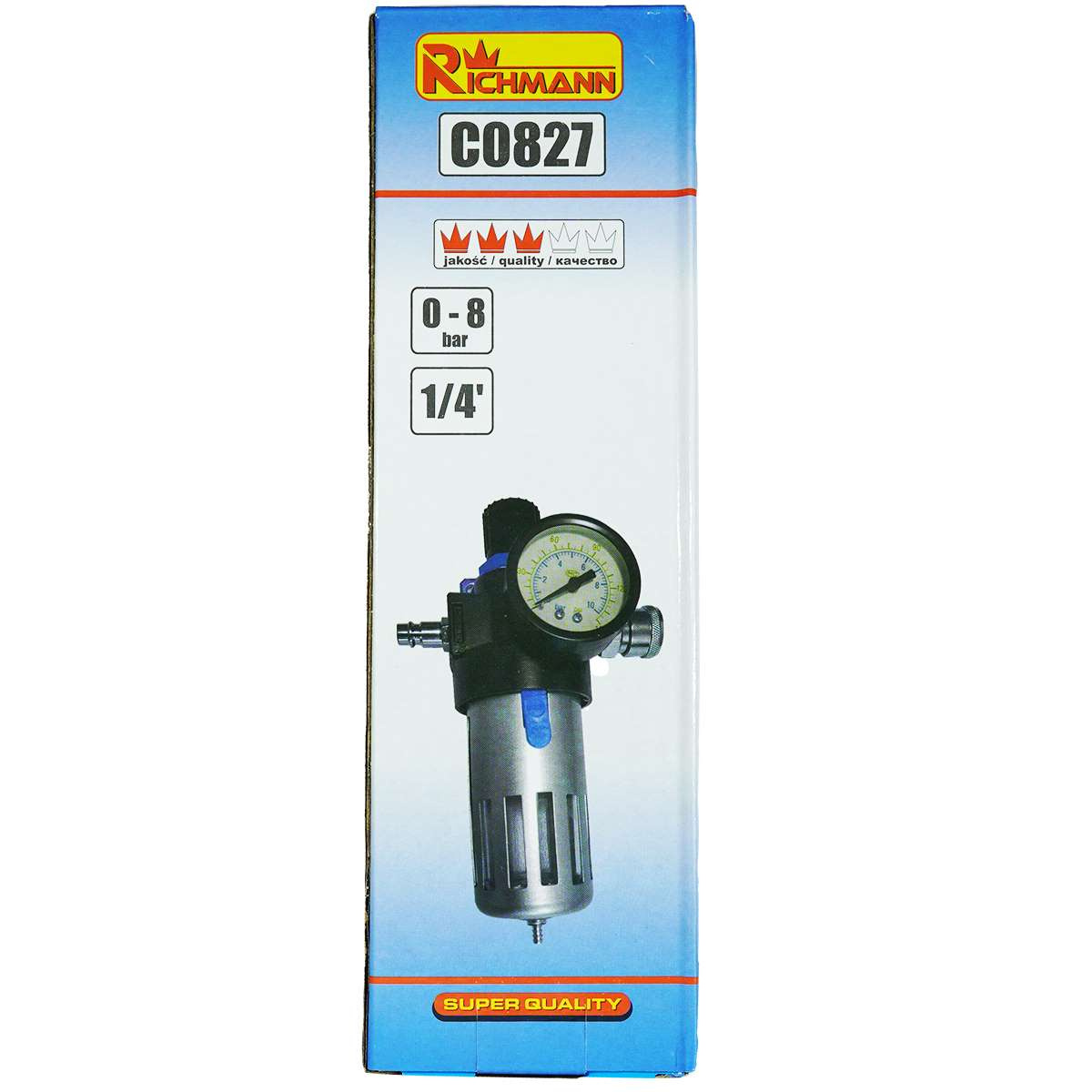 Filtr powietrza z reduktorem, odwadniacz, aluminiowy - służący do oczyszczania i osuszania sprężonego powietrza z wszelkich zanieczyszczeń, takich jak woda, kurz czy cząstki stałe, które mogą uszkodzić urządzenia pneumatyczne lub powodować zacieki podczas malowania. Filtr składa się z wkładu filtracyjnego, który zatrzymuje zanieczyszczenia i reduktora ciśnienia, który zmniejsza ciśnienie sprężonego powietrza do pożądanego poziomu. Odwadniacz służy do usuwania wilgoci ze sprężonego powietrza, która może powodować korozję i uszkodzenie narzędzi pneumatycznych. Obudowa aluminiowa.