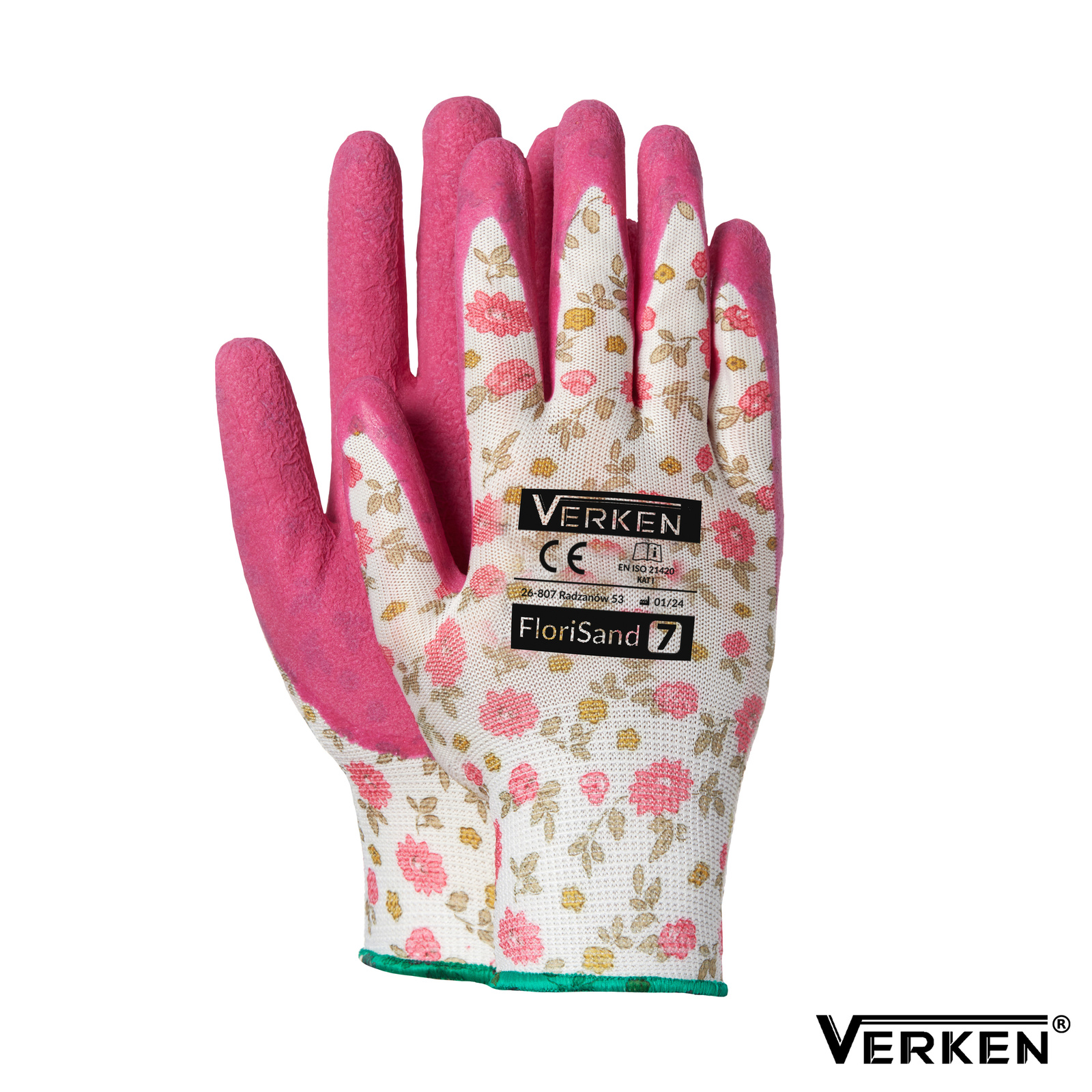 Rękawice wykonane z poliestru, powlekane różową pianką lateksową