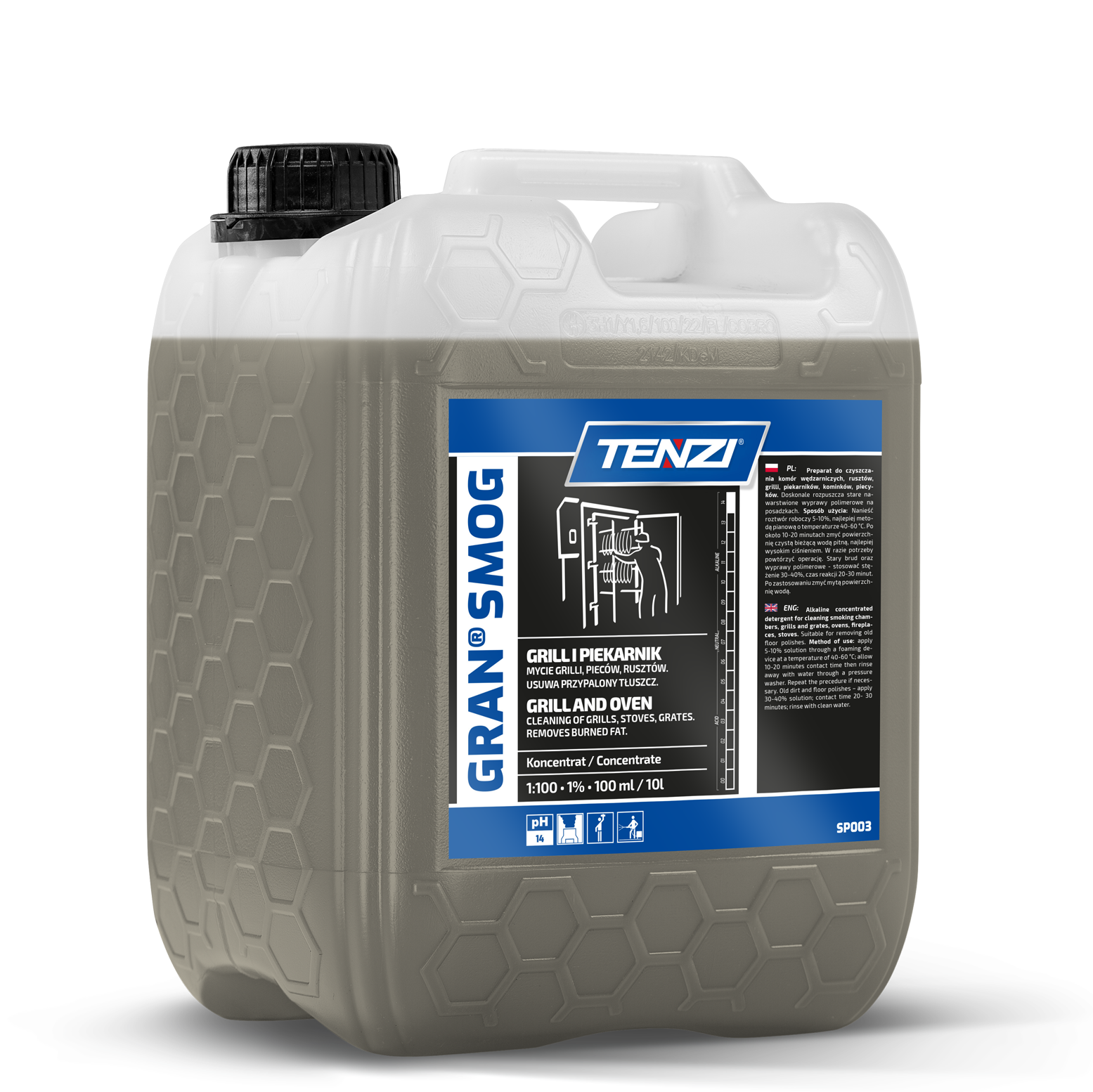 Silny koncentrat do czyszczenia tłustego brudu. Skutecznie usuwa przebarwienia i nagary, powstające podczas spalania tłuszczu, a także substancje smoliste i sadzę z urządzeń gastronomicznych typu piece, wędzarnie, grille, ruszty oraz kominki. Można stosować metodami: pianową, natryskową lub zanurzeniową. Zalecany również do zanieczyszczeń popożarowych ze wszystkich powierzchni. Idealne zastosowanie w warunkach przemysłowych. Usuwa nawet stare, kilkuletnie, nawarstwione wyprawy polimerowe. Zawiera inhibitory korozji. O neutralnym zapachu.