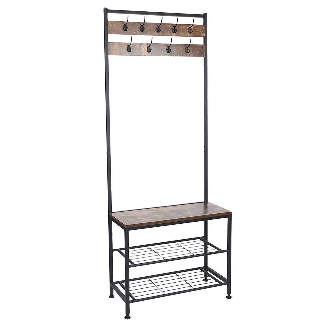 Garderoba stojąca Jacob marki Kuchinox to połączenie metalu z płytą MDF. Elegancki, nowoczesny wygląd uzyskuje dzięki połączeniu surowego, czarnego metalowego stelaża z siedziskiem w kolorze drewna. Bardzo kompaktowy model idealnie sprawdzi się w nowoczesnych mieszkaniach, jak i tradycyjnych gabinetach, gdzie dwurzędowo umieszczone wieszaki umożliwią przechowanie odzieży wierzchniej. Jednocześnie model zaprojektowano z dwoma półkami, na których możemy ustawić kilka par obuwia.