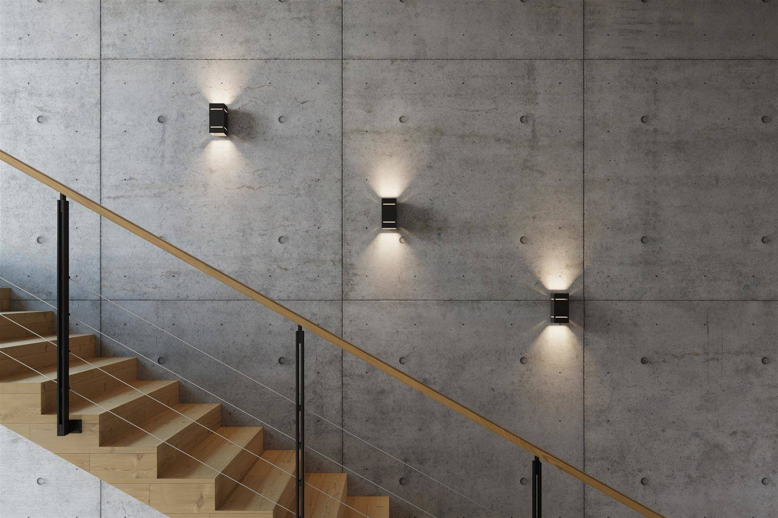 Światło rozchodzi się z kinkietu BLOCCO w górę i w dół oraz sączy się przez liniową perforację w bocznych ścianach klosza. Gdy go zaświecisz, zamienisz całą ścianę w efektowną dekorację.