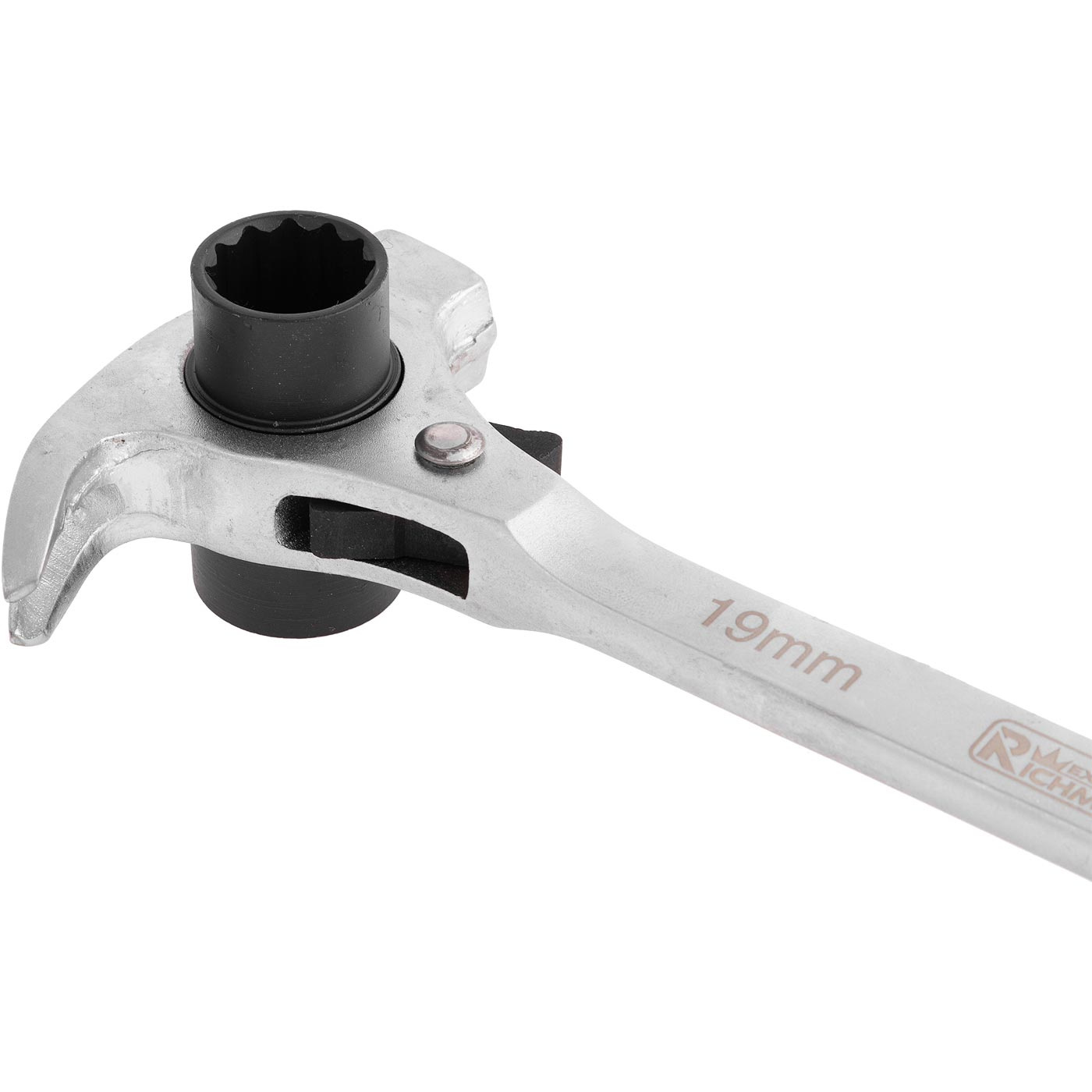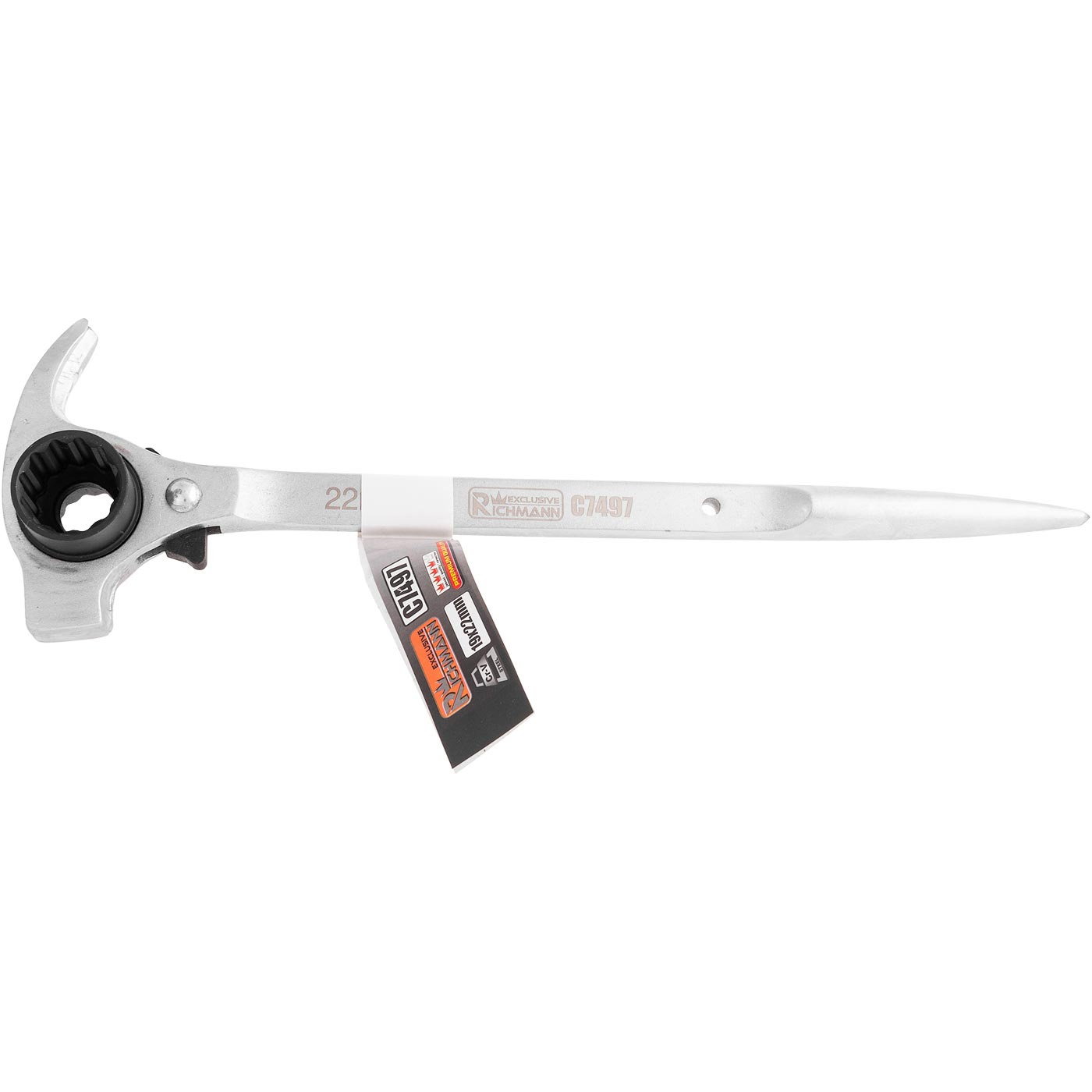 Podwójny klucz 12- kątny z grzechotką do rusztowań w rozmiarach 19 x 22 mm.