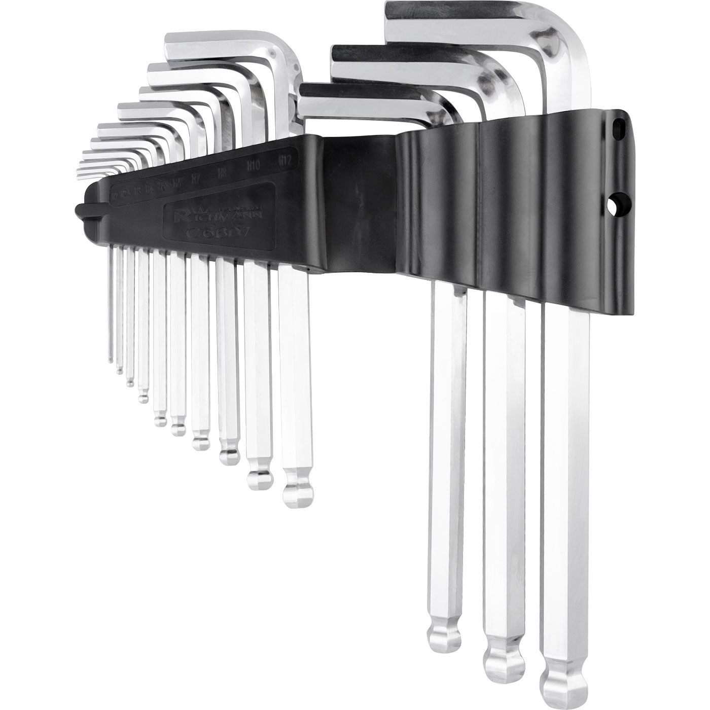 Zestaw 13 sztuk kluczy imbusowych z kulką w rozmiarach 2-19 mm.