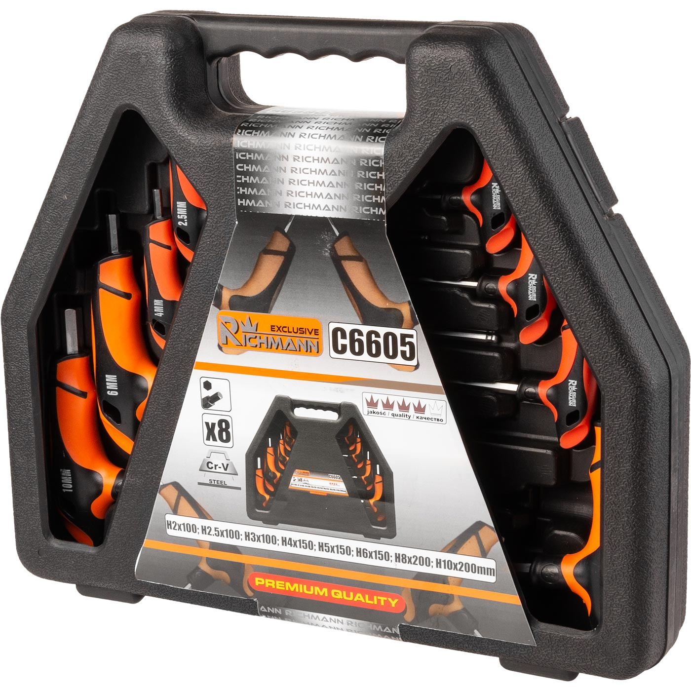 Zestaw 8 sztuk kluczy imbusowych trzpieniowy typu „T” z rękojeścią, umieszczony w praktycznej walizce.