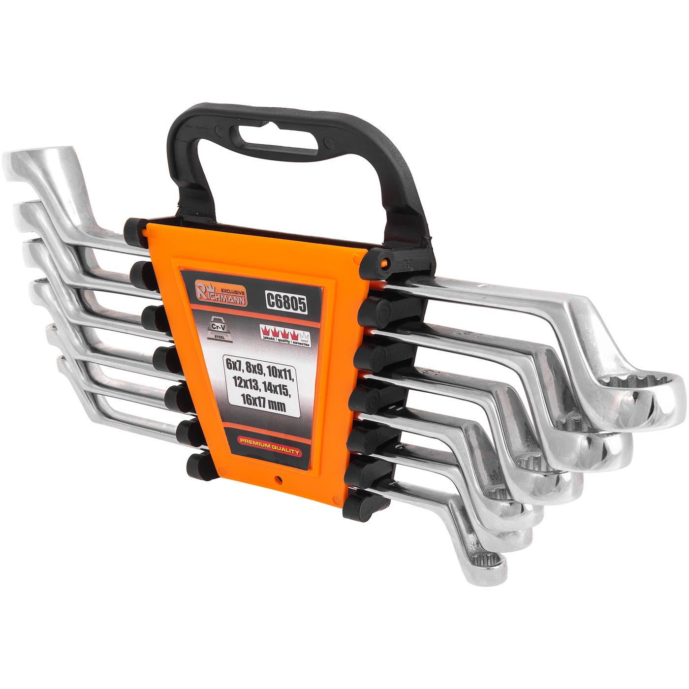 Dwustronny zestaw 6 szt. kluczy oczkowych giętych chromowanych w zakresie rozmiarów 6 - 17 mm.