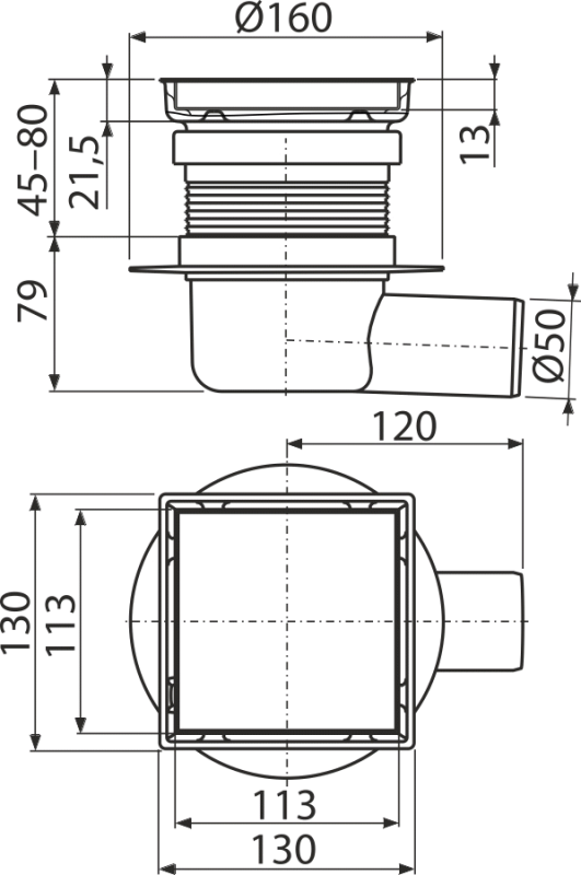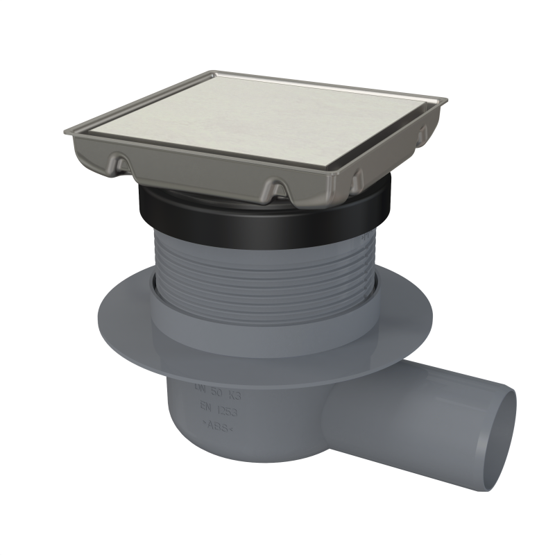 Kratka ściekowa 130×130 mm odpływ boczny, dwustronna kratka nierdzewna, syfon mokry