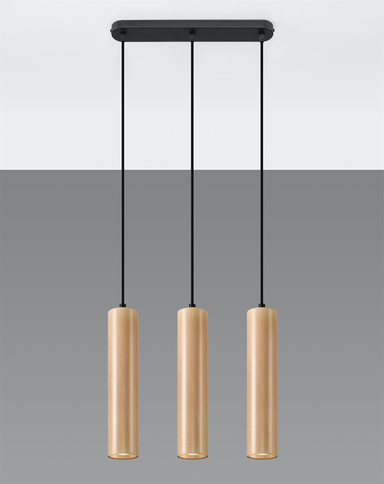 - Źródło światła: GU10, 3x40W, 3x12W LED, 50-60Hz, ~220-230V, IP20, klasa ochronności IŹródło światła nie jest w komplecie.Wymiary: 45/6/90 cmWymiary klosza: 6/30 cmMateriał: drewnoKolor: naturalne drewno