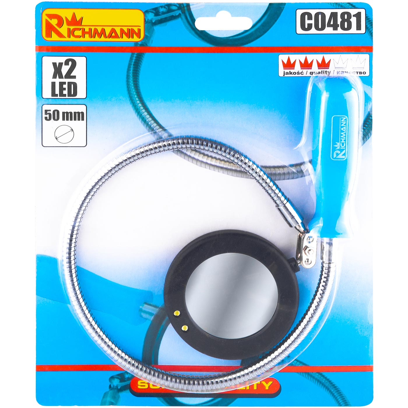 Giętkie okrągłe lusterko inspekcyjne z podświetleniem LED o średnicy 50 mm.