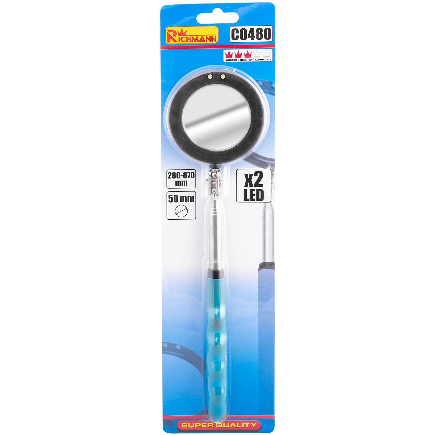 Okrągłe teleskopowe lusterko inspekcyjne z podświetleniem LED o średnicy 50 mm.
