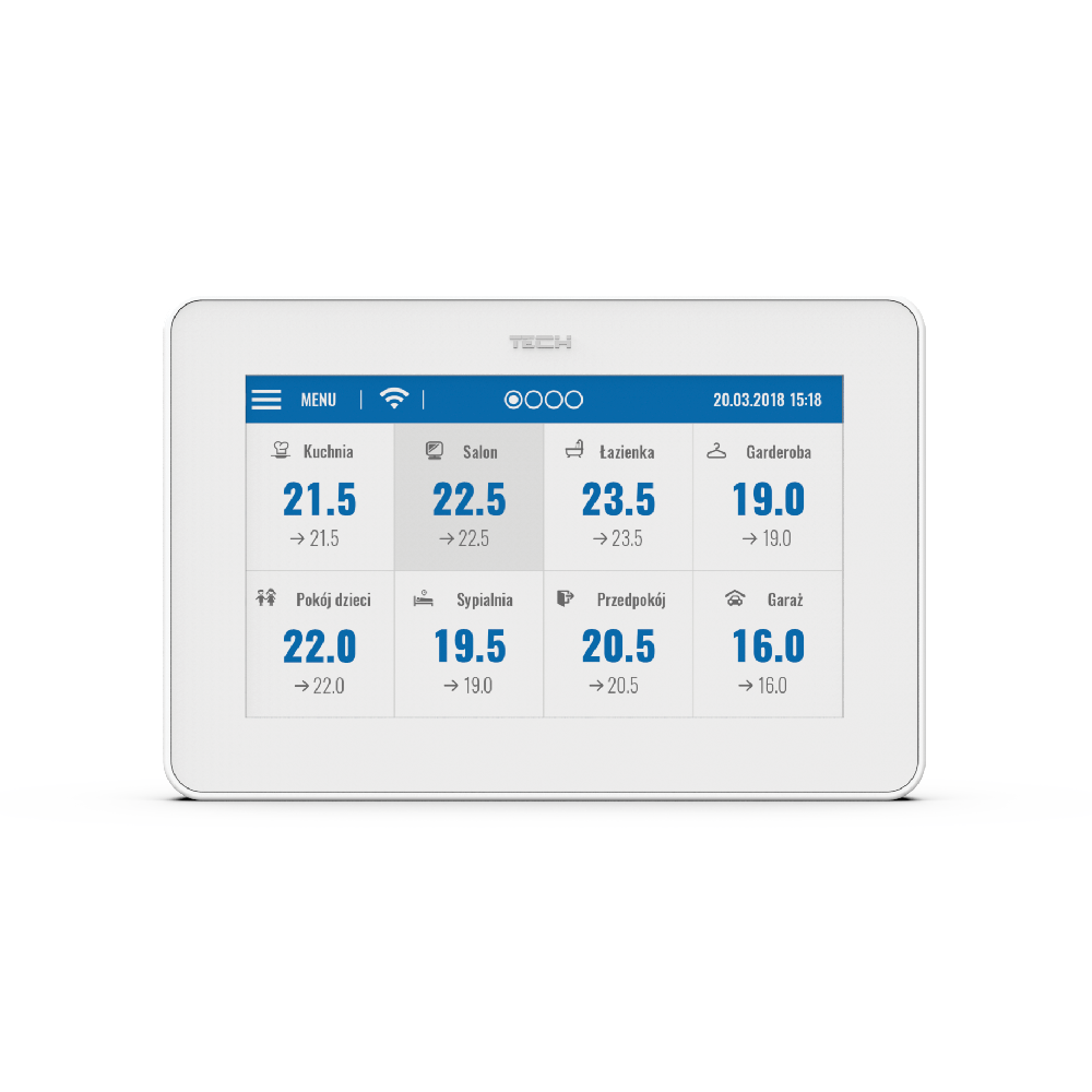 Uniwersalny panel kontrolny sterowników ogrzewania - montaż natynkowy M-12t to urządzenie, które usprawnia zarządzanie temperaturą w pomieszczeniach z zamontowanym systemem podłogowym serii 12. To dedykowane rozwiązanie do współpracy z listwą L-12 i przygotowane tak, by umożliwiało wygodne sterowanie podrzędnymi regulatorami pokojowymi w systemie. Funkcje panelu kontrolnego sterowania ogrzewaniem Panel M-12t jest urządzeniem nadrzędnym. Pozwala wygodnie kontrolować i edytować parametry pracy ogrzewania maksymalnie aż w 40 strefach. Z pomocą panelu kontrolnego sterowników ogrzewania można wygodnie definiować harmonogramy pracy, a także osobno ustalać wartość temperatury zadanej. Dodatkowo z poziomu panelu można włączać i wyłączać poszczególne strefy. Na wyświetlaczu panelu można również skorzystać z opcji dodatkowych jak ustawienie daty oraz godziny, wygaszacza ekranu, budzika, zaprogramować blokadę ekranu. Montaż i rejestracja urządzenia Uniwersalny panel kontrolny sterowników ogrzewania przeznaczony jest do montażu natynkowego. Warto pamiętać, że błędne podłączenie przewodów może doprowadzić do uszkodzenia sterownika, dlatego warto, aby instalację przeprowadziła osoba z odpowiednimi kwalifikacjami. Sterownik należy zarejestrować do listwy L-12 można to wykonać przewodowo (TECH SBUS) lub bezprzewodowo (WTP). Jak korzystać z panelu kontrolnego sterowników ogrzewania Czytelny, dotykowy panel umożliwia łatwe zarządzanie pracą podrzędnych urządzeń. Aby dokonać ustawień w podrzędnej sterownikowi strefie, wystarczy kliknąć obszar ekranu z informacją o jego stanie. Wygląd wyświetlacza panelu kontrolnego sterowników ogrzewania można dopasować do swoich potrzeb, korzystając z funkcji ustawienia ekranu. Można m.in. ustawić wygaszacz ekranu w postaci zegara albo daty. Dodatkowo użytkownik ma możliwość wyboru wersji kolorystycznej ekranu sterownika oraz włączenia lub wyłączenia dźwięku. Opis funkcji i wyposażenia sterowników aktualny tylko i wyłącznie z produktami dostępnymi w danym roku kalendarzowym. W celu potwierdzenia posiadanych możliwości danego sprzętu należy kontaktować się z działem techniczno-serwisowym firmy TECH STEROWNIKI. TECH STEROWNIKI Spółka z ograniczona odpowiedzialnością Sp. k. zastrzega sobie prawo wprowadzania bez uprzedzenia zmian parametrów technicznych, wyposażenia i specyfikacji oferowanych towarów. Zawarte na stronie wszelkie informacje, w szczególności zaprezentowane fotografie, specyfikacje, opisy, rysunki lub parametry techniczne nie stanowią zapewnienia w rozumieniu art. 4 ust. 3 i 4 Ustawy z dnia 27 lipca 2002 roku o szczególnych warunkach sprzedaży konsumenckiej oraz o zmianie Kodeksu Cywilnego (dalej „Ustawa”), a także nie stanowią opisu towaru w rozumieniu art. 4 ust. 2 Ustawy. Niniejsza strona nie stanowi oferty w rozumieniu art. 66 Kodeksu Cywilnego.