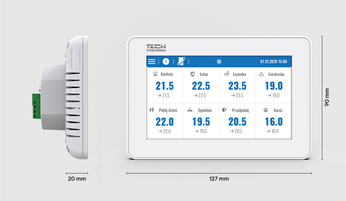 Panel M-12 jest urządzeniem nadrzędnym. Pozwala wygodnie kontrolować i edytować parametry pracy ogrzewania maksymalnie aż w 40 strefach. Z pomocą panelu kontrolnego sterowników ogrzewania można wygodnie definiować harmonogramy pracy, a także osobno ustalać wartość temperatury zadanej. Dodatkowo z poziomu panelu można włączać i wyłączać poszczególne strefy. Na wyświetlaczu panelu można również skorzystać z opcji dodatkowych jak ustawienie daty oraz godziny, wygaszacza ekranu, budzika, zaprogramować blokadę ekranu.
