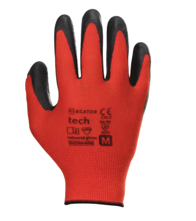 - MERCATOR tech rękawice robocze, czerwone, poliestrowe, powlekane poliuretanem w kolorze czarnym rozmiar L