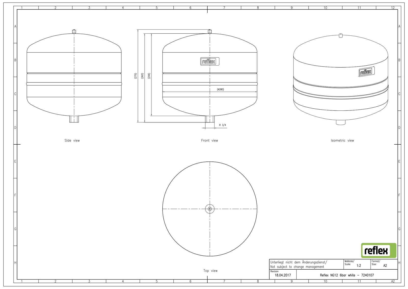 Ciśnieniowe naczynie przeponowe do zamkniętych instalacji grzewczych i chłodniczych. Konstrukcja zgodnie z EN 13831, dopuszczenie zgodnie z dyrektywą UE o urządzeniach ciśnieniowych 2014/68/UE, oznaczenie CE.