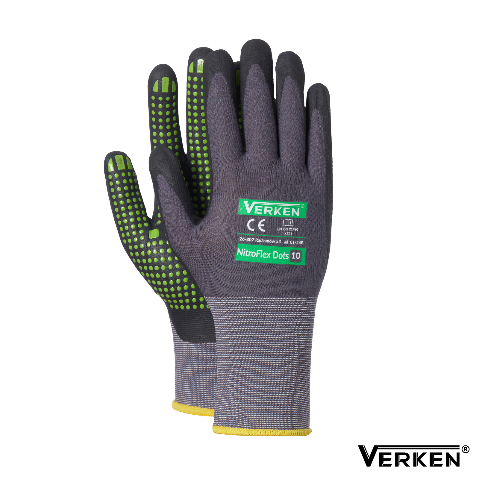 Rękawice wykonane z mieszanki spandexu i lycry (ścieg 15g), powlekane pianką nitrylową dodatkowo nakropione PVC
