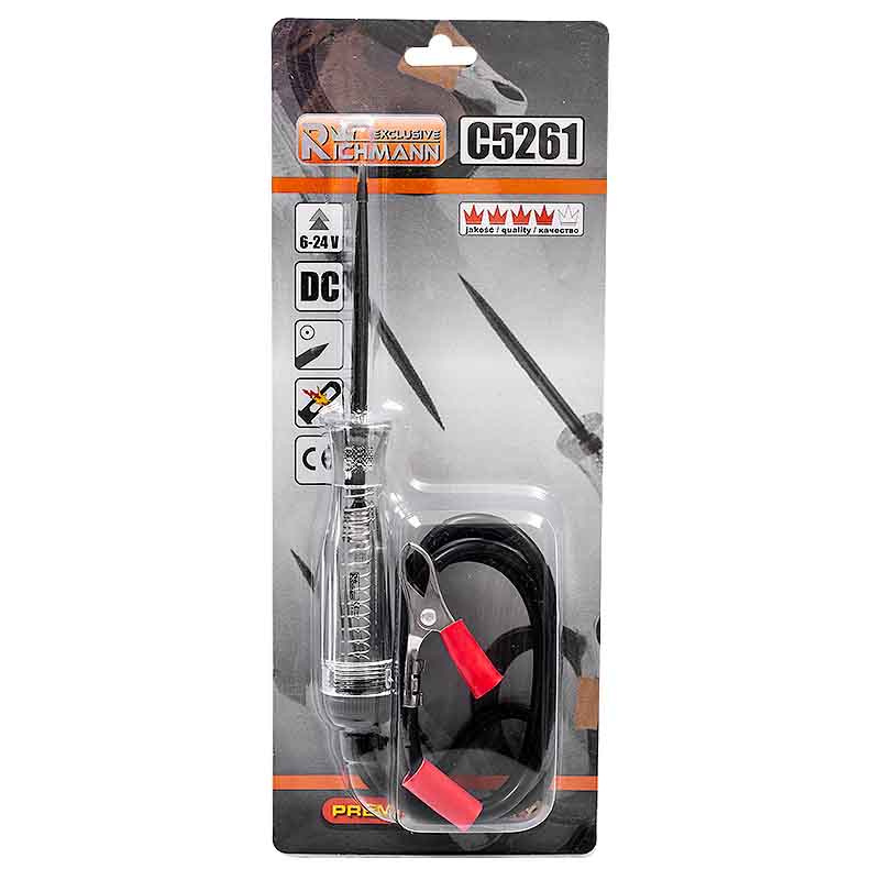 Samochodowy próbnik napięć 6-24V z przewodem pomiarowym oraz zaciskiem uziemiającym typu „krokodylek”.
