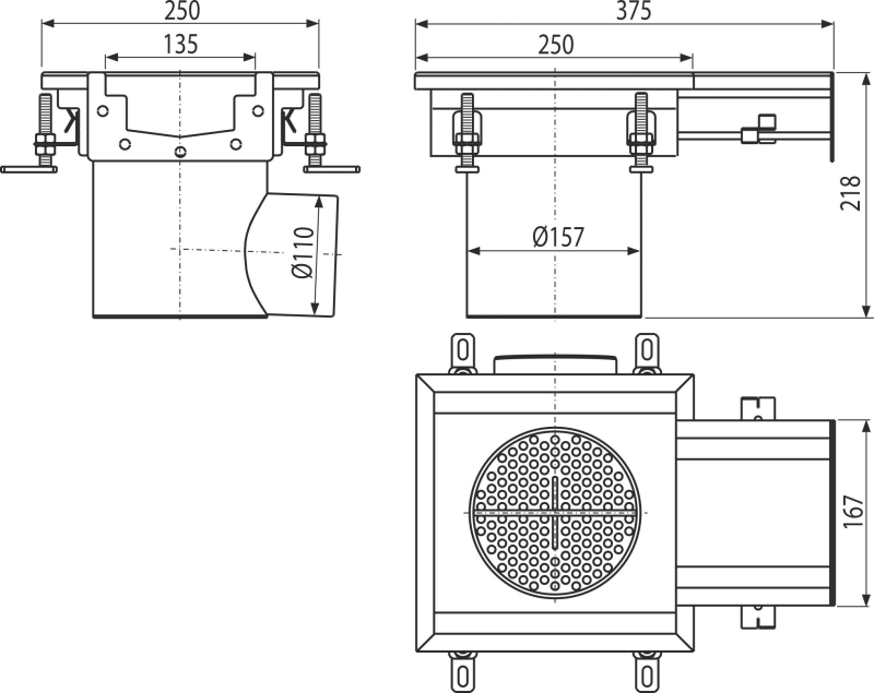 Przemysłowy odpływ punktowy z wpustem skrzynkowym 250×250-135, stal nierdzewna AISI 316L