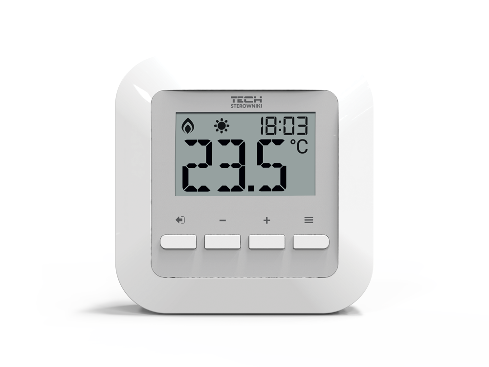 Funkcje sterownika sterowanie temperaturą pokojową +/- z dokładnością 0,1°C histereza w zakresie od 0,2 do 8 °C tryb dzień/noc tryb pracy ręcznej sterowanie według temperatury podłogi (w przypadku wykorzystania czujnika podłogowego) komunikacja przewodowa Wyposażenie sterownika wbudowany czujnik pokojowy chwilowe podświetlenie wyświetlacza baterie 2 x AAA 1,5V Opis funkcji i wyposażenia sterowników aktualny tylko i wyłącznie z produktami dostępnymi w danym roku kalendarzowym. W celu potwierdzenia posiadanych możliwości danego sprzętu należy kontaktować się z działem techniczno-serwisowym firmy TECH STEROWNIKI. TECH STEROWNIKI Spółka z ograniczona odpowiedzialnością Sp. k. zastrzega sobie prawo wprowadzania bez uprzedzenia zmian parametrów technicznych, wyposażenia i specyfikacji oferowanych towarów. Zawarte na stronie wszelkie informacje, w szczególności zaprezentowane fotografie, specyfikacje, opisy, rysunki lub parametry techniczne nie stanowią zapewnienia w rozumieniu art. 4 ust. 3 i 4 Ustawy z dnia 27 lipca 2002 roku o szczególnych warunkach sprzedaży konsumenckiej oraz o zmianie Kodeksu Cywilnego (dalej „Ustawa”), a także nie stanowią opisu towaru w rozumieniu art. 4 ust. 2 Ustawy. Niniejsza strona nie stanowi oferty w rozumieniu art. 66 Kodeksu Cywilnego.