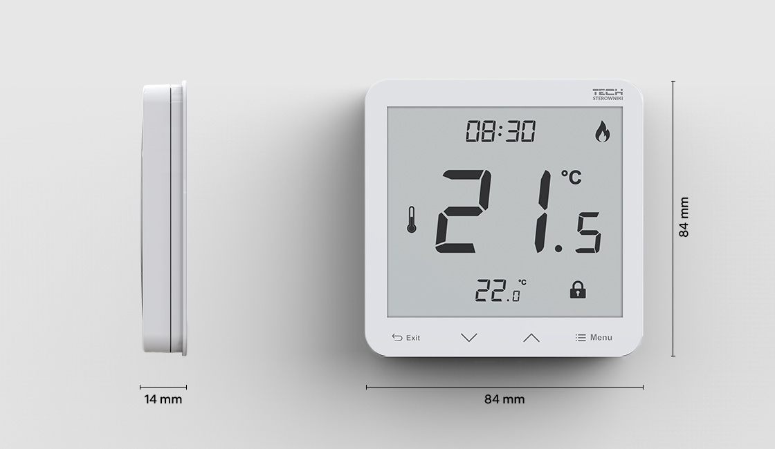 Funkcje 2 kolory obudowy: biały, czarny przewodowa komunikacja TECH SBUS sterowanie temperaturą pokojową pomiar wilgotności powietrza czasowy program ogrzewania sterowanie według temperatury podłogi (w przypadku wykorzystania czujnika podłogowego) szklany front dotykowe klawisze wyświetlacz dedykowany LCD, z chwilowym podświetleniem