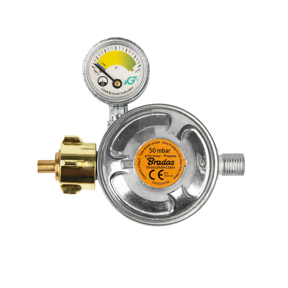 Reduktor gazowy 50mbar, 1,5kg/h, z zaworem bezpieczeństwa i manometrem, GZ 1/4" L