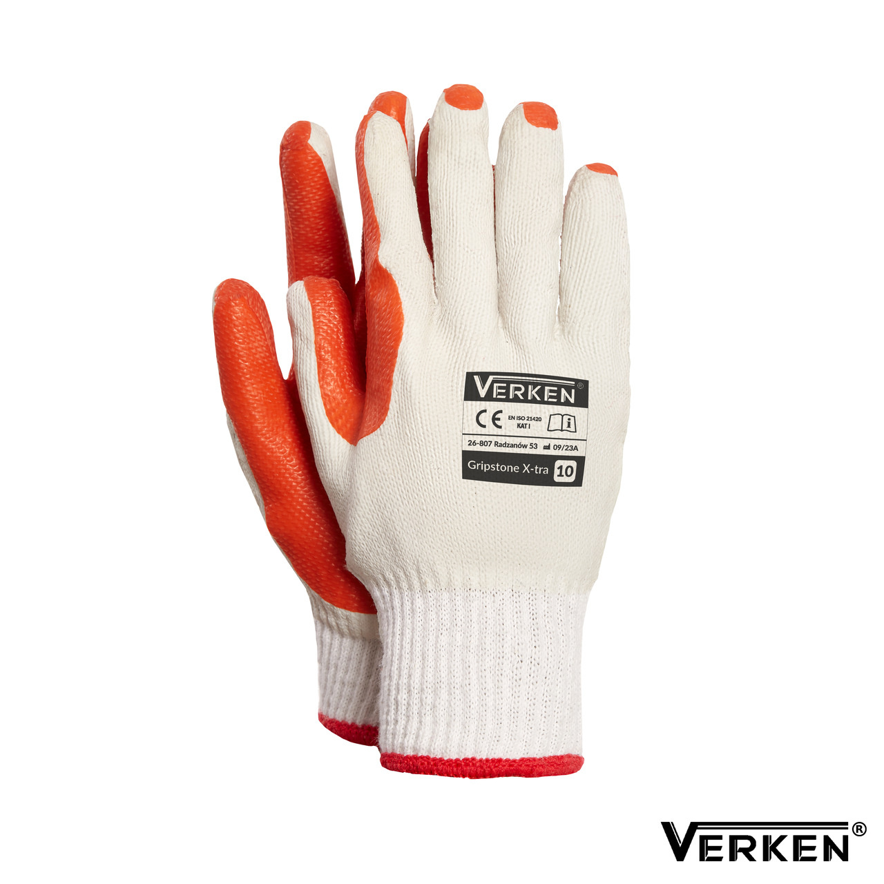 Rękawice brukarskie wykonane z bawełny pokryte wulkanizowaną gumą w kolorze czerwonym w części chwytnej, dodatkowo powleczone cienką wartwą lateksu w kolorze białym