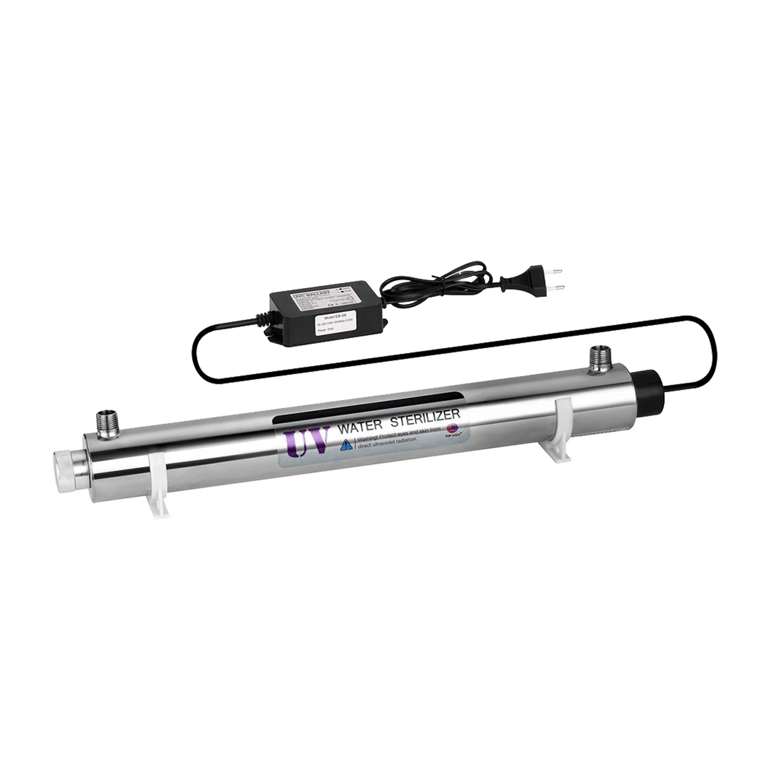 Należy pamiętać, że efektywność sterylizatora zależy w dużej mierze od jakości wody, która przez niego przepływa, dlatego zlecamy stosowanie filtrów narurowych przed sterylizatorem, w celu usunięcia wszelkich zanieczyszczeń mechanicznych, takich jak piasek. Dodatkowo należy mieć na uwadze, że wpływ na skuteczność oczyszczania wody ma również zawartość żelaza oraz twardość wody. Żelazo znajdujące się w wodzie, nie powinno przekraczać poziomu 0,1 mg/l, natomiast twardość wody powinna być niższa niż 110 CaCO3 mg/l.