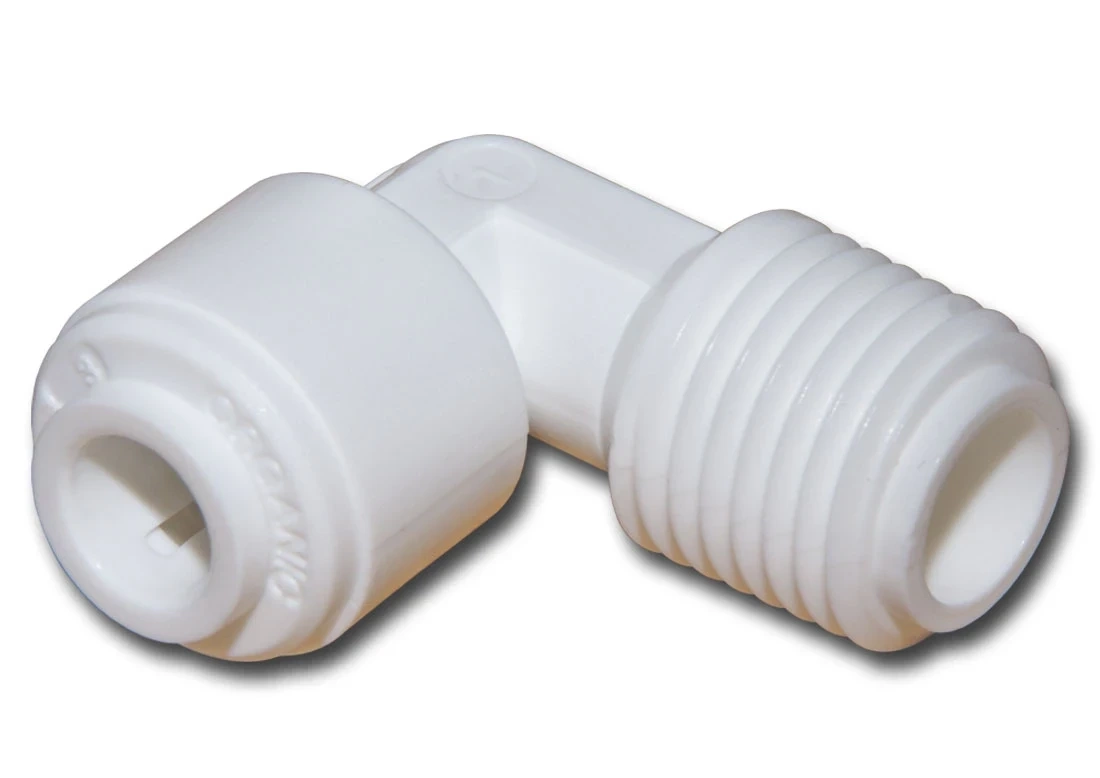 Szybkozłączka kolanko - podstawowy element montażowy stosowany w domowych filtrach wody. Umożliwia połączenie wężyka 1/4 cala (około 6,4 mm) z elementem gwintowanym 1/4 cala.