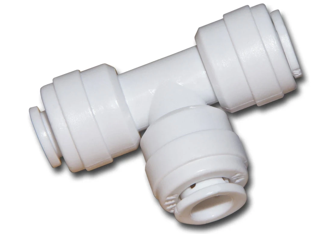 Szybkozłączka trójnik - podstawowy element montażowy stosowany w domowych filtrach wody UST-M. Umożliwia połączenie i rozdzielenie wężyka 1/4 cala (około 6,4 mm).