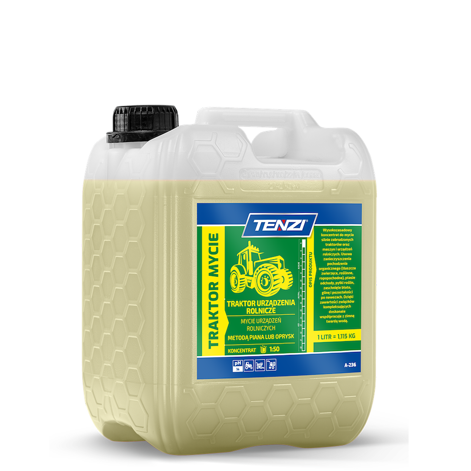 Wysokozasadowy koncentrat do mycia silnie zabrudzonych traktorów oraz maszyn i urządzeń rolniczych. Usuwa zanieczyszczenia pochodzenia organicznego (tłuszcza zwierzęce, roślinne, ropopochodne), ptasie odchody, pyłki roślin, zaschnięte błoto, glinę i pozostałości po nawozach. Dzięki zawartości związków kompleksujących doskonale współpracuje z zimną twardą wodą.