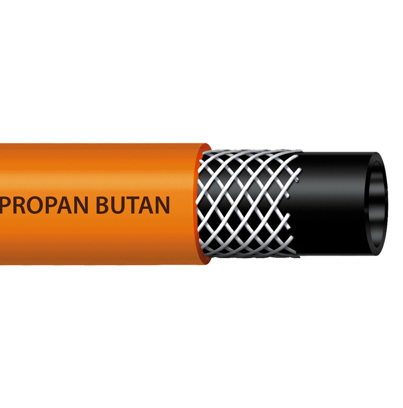 PROPAN-BUTAN - 3-warstwowy wąż do gazu ze zbrojeniu poliestrowym odpornym na rozerwanie. Wyprodukowany ze specjalnych komponentów PVC oraz różnych rodzajów kauczuku. Idealny do transportu gazu propan butan w gospodarstwach domowych, głównie do łączenia butli gazowych z urządzeniami gospodarstwa domowego. Posiada homologację i certyfikat Zakładu Badań i Atestów "ZETOM". Kolor pomarańczowy.
