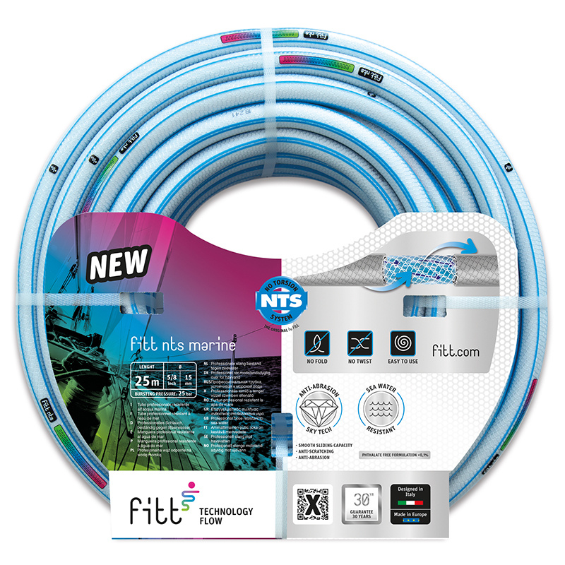 Dzięki wyjątkowej i oryginalnej siatce NTS, FITT NTS MARINE jest wężem zapewniającym doskonałą rozciągliwość, zapobiegając powstawaniu supłów i skręceń, gwarantując stały przepływ wody. Jest szczególnie zalecany do użycia w żeglarstwie, odporny na wodę morską, doskonały do użycia na wszystkich rodzajach łodzi.Technologia SKY TECH zwiększa odporność na przecięcia i otarcia co sprawia, że wąż jest wyjątkowo gładki i łatwy w użyciu.Umożliwia to przeciąganie go po wszystkich powierzchniach, również w narożnikach. Powłoka ochronna SKY TECH ze specjalną formułą chroniącą przed promieniowaniem UV, zapobiega przedwczesnemu starzeniu się węża.Biały wąż nadający się do użycia w branży żeglarskiej, odpowiedni do kontaktu z wodą morską.BUDOWA: wąż o 6-warstwowej konstrukcji z przezroczystą powłoką zewnętrzną, dwiema liniami w intensywnym kolorze niebieskim, z folią SKY TECH ze specjalną formułą anty-UV, która zapobiega starzeniu się węża i nadaje mu specjalne, satynowe wykończenie, ze wzmocnieniem tekstylnym z NTS, pośrednią białą warstwą wspierającą, czarną warstwą antyalgową, białym wewnętrznym zabezpieczeniem.