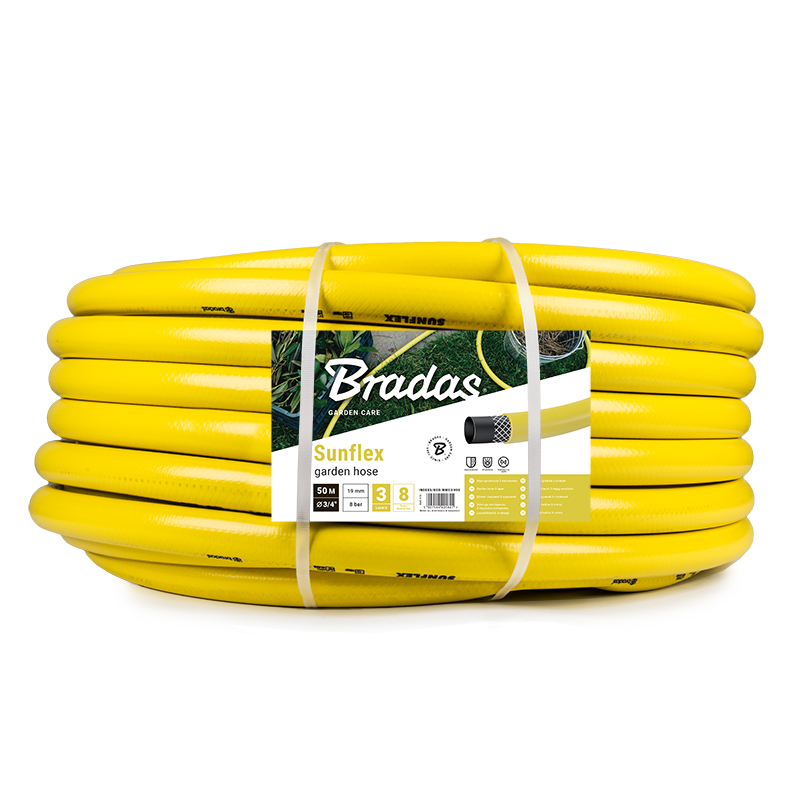 SUNFLEX - wąż ogrodniczy 3-warstwowy, zbrojony. Wykonany z miękkiego PVC.I warstwa - wewnętrzna, z czarnego PVC odporna na UV i osadzanie się glonów w wężuII warstwa - oplot krzyżowy z włókna syntetycznegoIII warstwa - zewnętrzna, żółta transparentna z miękkiego PVC