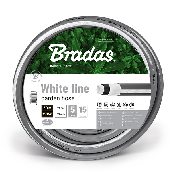 WHITE LINE - wąż ogrodniczy 5-warstwowy, zbrojony specjalnym poliestrowym oplotem TRICOT o zwiększonej wytrzymałości na ciśnienie wody. Wykonany z nowej generacji tworzywa PVC, nie zawierającego substancji toksycznych. Jest odporny na promieniowanie UV i elastyczny w niskich temperaturach. Do profesjonalnego zastosowania.I warstwa - wewnętrzna, z białego tworzywaII warstwa - z czarnego tworzywa, zabezpieczająca przed osadzaniem się glonów wewnątrz wężaIII warstwa - biała, z elastycznego tworzywa PVCIV warstwa - specjalny poliestrowy oplot TRICOT V warstwa - zewnętrzna, szara z białym paskiem, odporna na warunki atmosferyczne