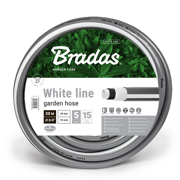WHITE LINE - wąż ogrodniczy 5-warstwowy, zbrojony specjalnym poliestrowym oplotem TRICOT o zwiększonej wytrzymałości na ciśnienie wody. Wykonany z nowej generacji tworzywa PVC, nie zawierającego substancji toksycznych. Jest odporny na promieniowanie UV i elastyczny w niskich temperaturach. Do profesjonalnego zastosowania.I warstwa - wewnętrzna, z białego tworzywaII warstwa - z czarnego tworzywa, zabezpieczająca przed osadzaniem się glonów wewnątrz wężaIII warstwa - biała, z elastycznego tworzywa PVCIV warstwa - specjalny poliestrowy oplot TRICOT V warstwa - zewnętrzna, szara z białym paskiem, odporna na warunki atmosferyczne