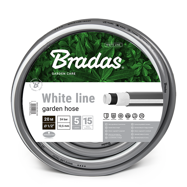 WHITE LINE - wąż ogrodniczy 5-warstwowy, zbrojony specjalnym poliestrowym oplotem TRICOT o zwiększonej wytrzymałości na ciśnienie wody. Wykonany z nowej generacji tworzywa PVC, nie zawierającego substancji toksycznych. Jest odporny na promieniowanie UV i elastyczny w niskich temperaturach. Do profesjonalnego zastosowania.I warstwa - wewnętrzna, z białego tworzywaII warstwa - z czarnego tworzywa, zabezpieczająca przed osadzaniem się glonów wewnątrz wężaIII warstwa - biała, z elastycznego tworzywa PVCIV warstwa - specjalny poliestrowy oplot TRICOT V warstwa - zewnętrzna, szara z białym paskiem, odporna na warunki atmosferyczne