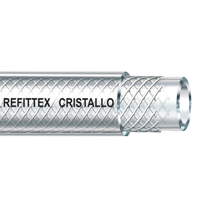 REFITTEX CRISTALLO - wąż techniczny, wyprodukowany z najwyższej jakości miękkiego PVC. Zbrojony potrójną przędzą poliestrową, posiadający tekstylne wzmocnienie. Nadaje się do przepływu powietrza, substancji spożywczych, środków ochrony roślin i lekkich chemikaliów pod ciśnieniem. Spełnia normy dyrektywy Reg. (EU) 10/2011 + Stimulants.Ciśnienie rozrywające = ok. 3x ciśnienie robocze. Przezroczystość węża umożliwia stałą kontrolę optyczną materiału przepływającego, przez co łatwo zauważa się ewentualne zanieczyszczenia. Wytrzymałość ciśnieniowa zależna jest od temperatury cieczy przepływającej oraz od średnicy węża. Temperatura pracy: od -20C° do +60C°.Węże REFITTEX CRISTALLO są:- bardzo giętkie- trwałe, odporne na działanie światła i tlenu- posiadają wysoką wytrzymałość na ścieranie- samogasnące po usunięciu ich z płomienia- niewrażliwe pod względem chemicznym- odporne na działanie oleju i benzyny- odporne na działanie gorącej wody na bezciśnieniowym przepływie- nadają się do sterylizacji- przyjazne dla środowiska, nie zawierają kadmu - wolne od składników toksycznych