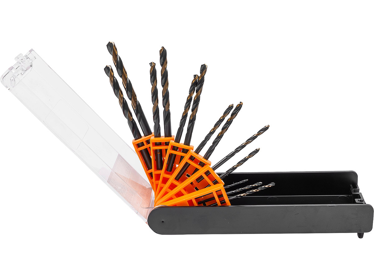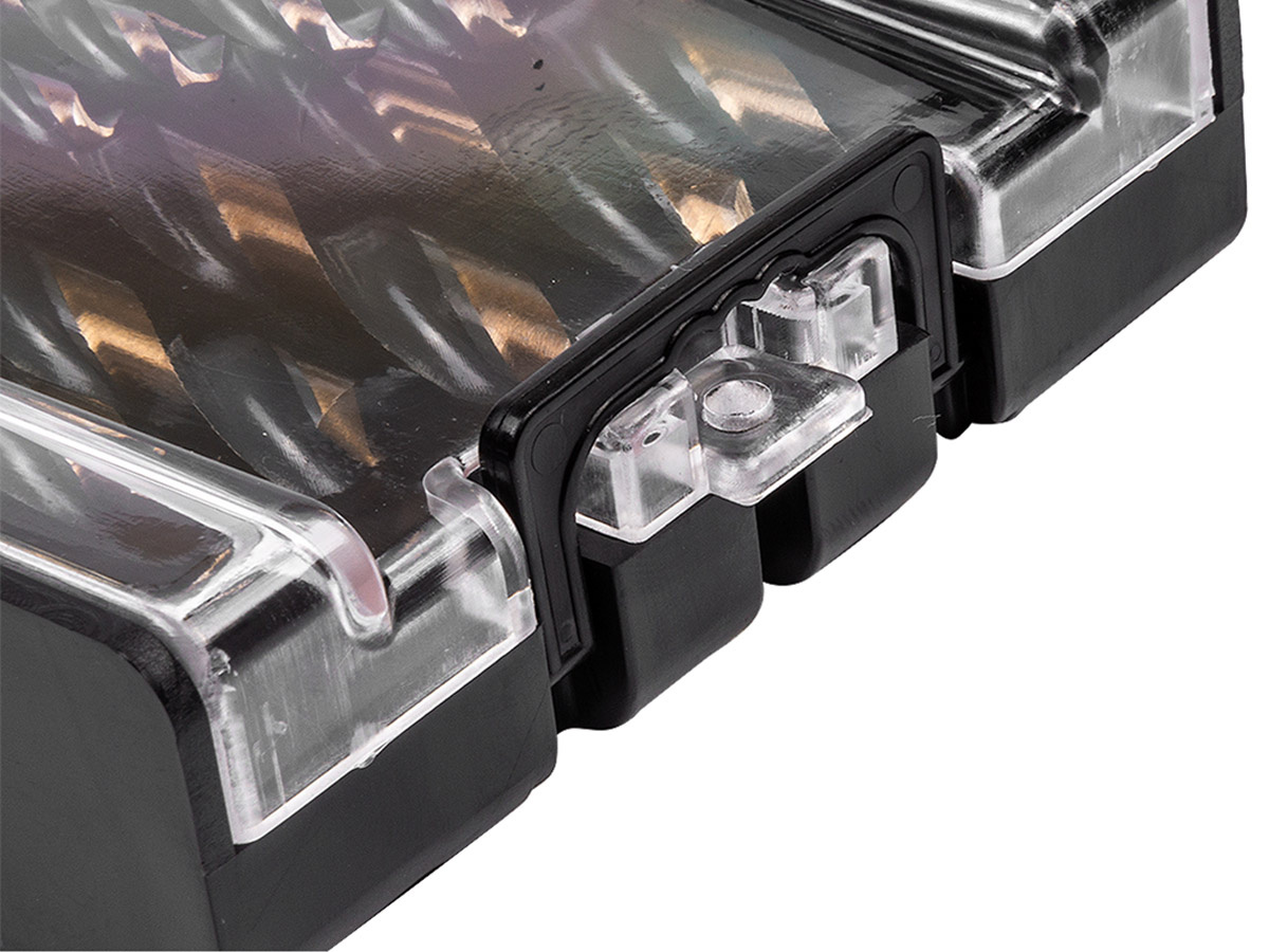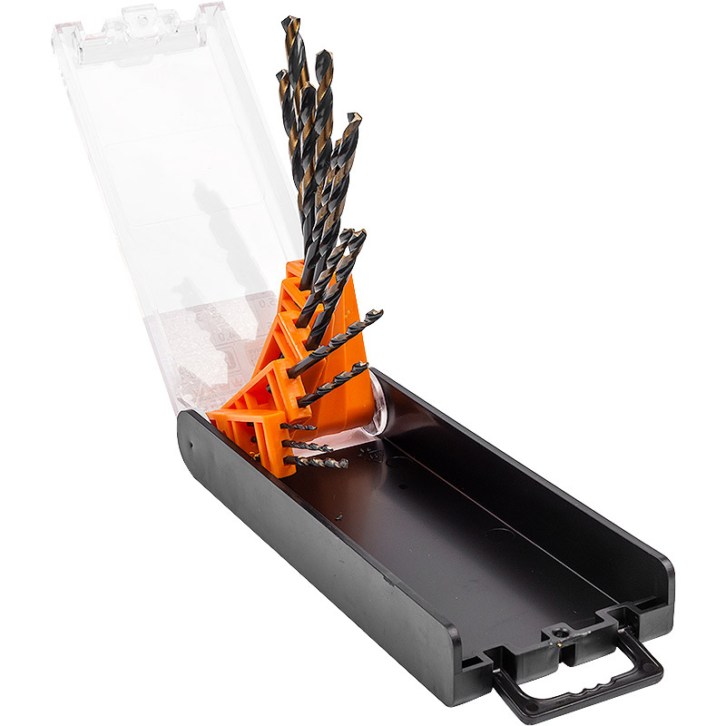 Zestaw umieszczony w kompozytowej kasecie z uporządkowanym i podpisanym z zewnątrz miejscem na każdy rozmiar wiertła.