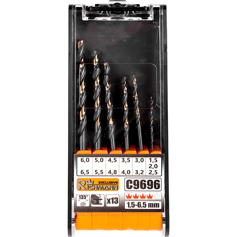 Zestaw 13 sztuk wierteł przeznaczonych do wiercenia otworów w metalu i stali w zakresie 1,5 - 6,5 mm.