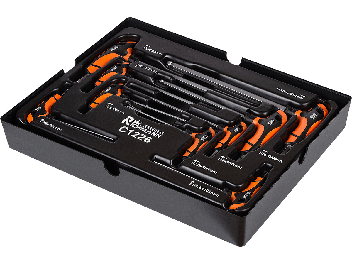 Zestaw 9 kluczy imbusowych z uchwytem "T" umieszczonych we wkładzie do wózka warsztatowego typu B.
