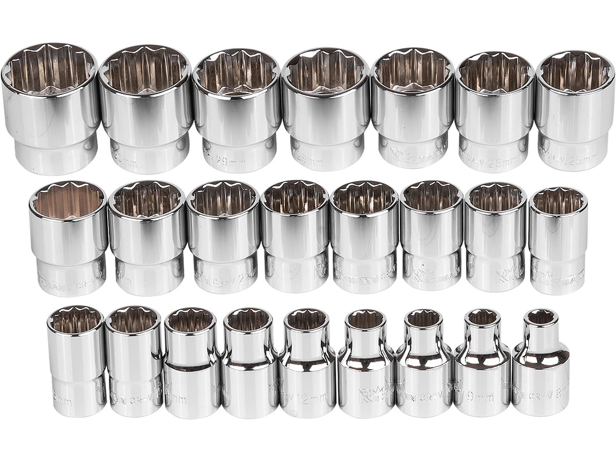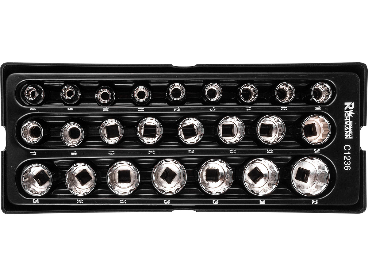 Zestaw zawiera rozmiary [mm]: 8, 9, 10, 11, 12, 13, 14, 15, 16, 17, 18, 19, 20, 21, 22, 23, 24, 25, 26, 27, 28, 29, 30, 32